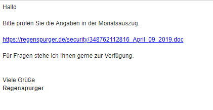 Die folgende E-Mail ist nicht von uns! Bitte löschen Sie die Mail! Wir versenden weder Monatsauszüge noch .doc Dateien. Sollten Sie sich bei einer eingegangen E-Mail nicht sicher sein, rufen Sie uns an.